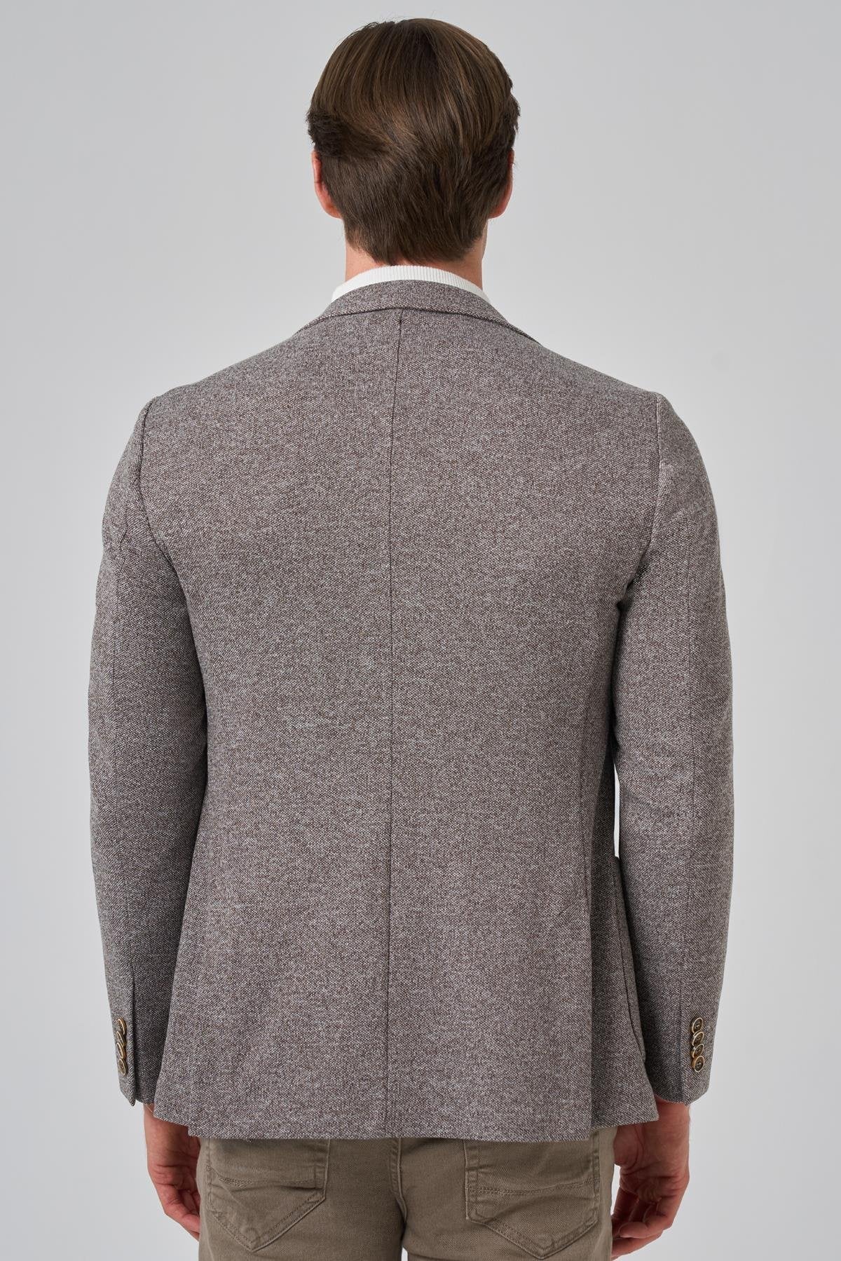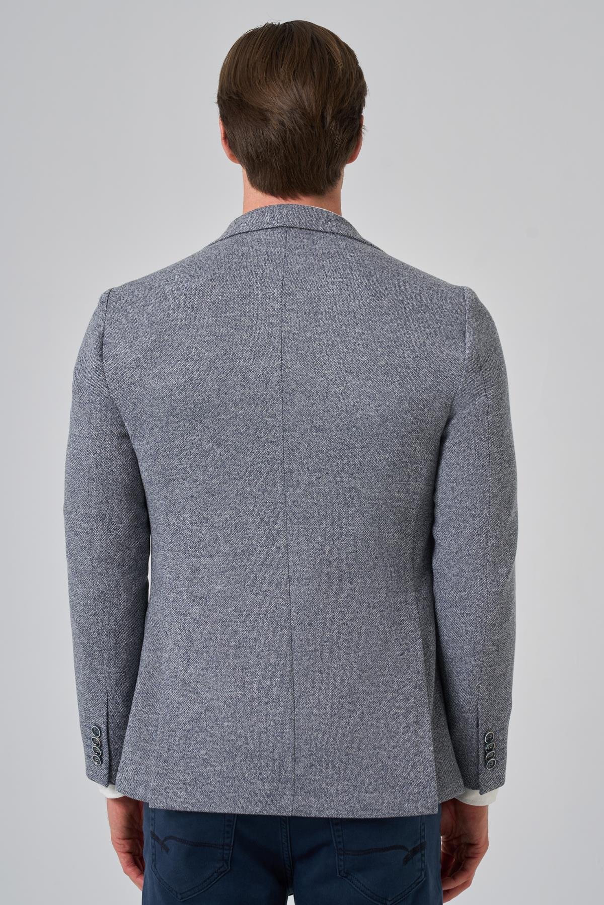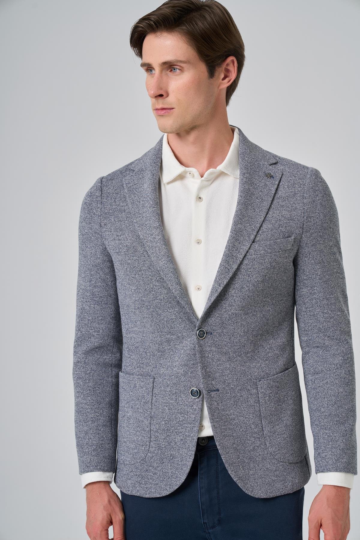 Introducing the Morven Men's Patterned Slim Fit Blazer, a stylish addition to any modern man's wardrobe. This jacket features a contemporary slim fit and an eye-catching patterned design, complemented by a sleek mono collar. Made from a premium blend of 82% polyester, 14% cotton, and 4% elastane, it offers both comfort and flexibility. The flap pocket and secure button closure enhance its practicality, while the long sleeves and unlined construction provide breathability, making it ideal for layering. The double slit design allows for greater mobility and adds a sophisticated touch. The model, wearing a sample size 50, stands at 187 cm tall with measurements of 99 cm in chest, 80 cm in waist, and 94 cm in hip. Please note that color differences may occur due to lighting and shadows in the studio shooting environment. During the shoot, a T-shirt, pants, and shoes were used as accessories; these items will not be included with the jacket.