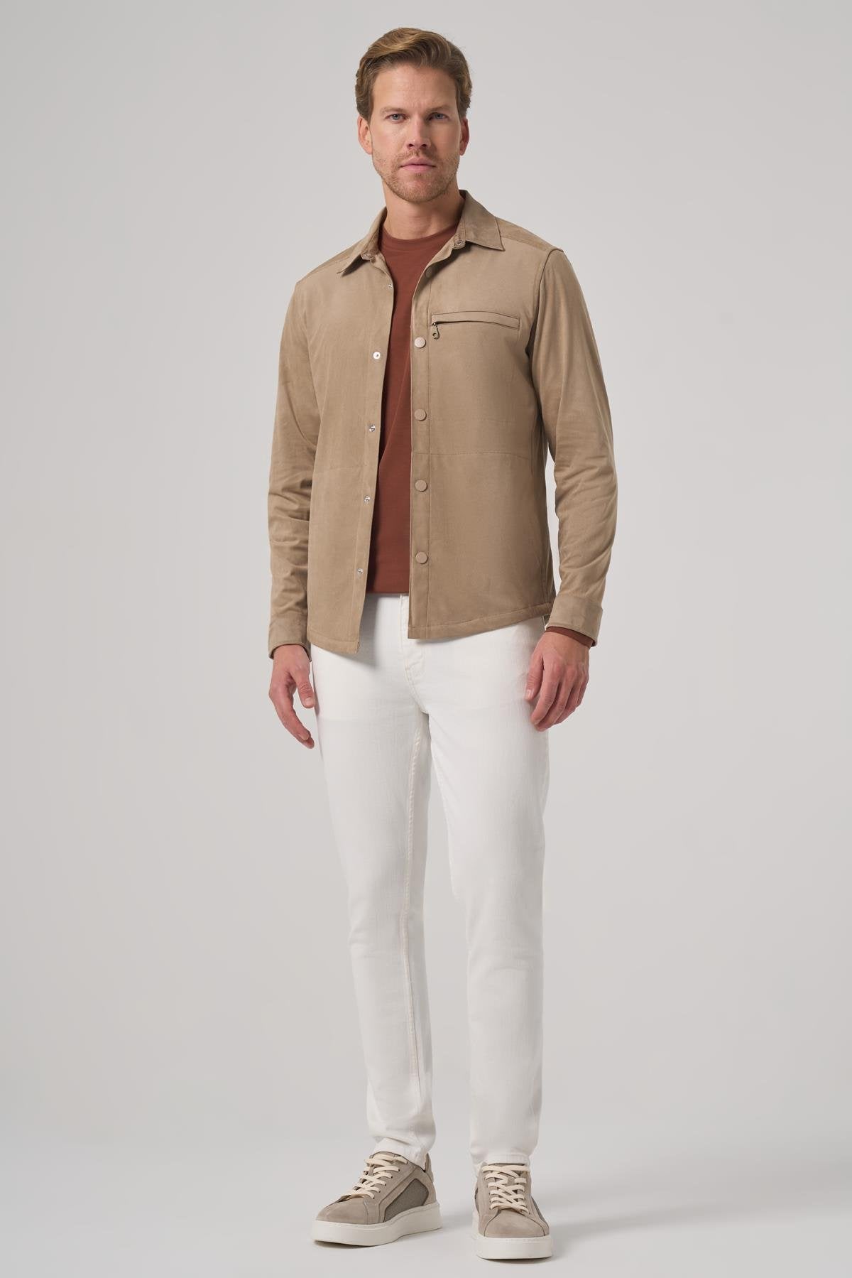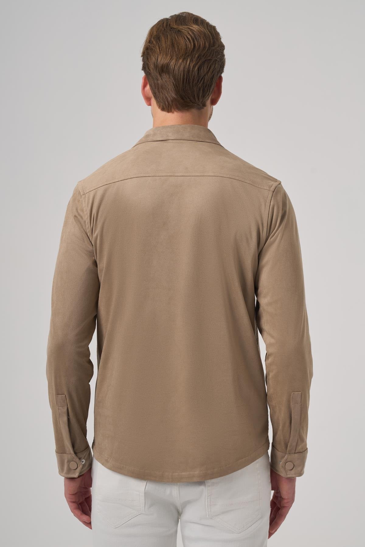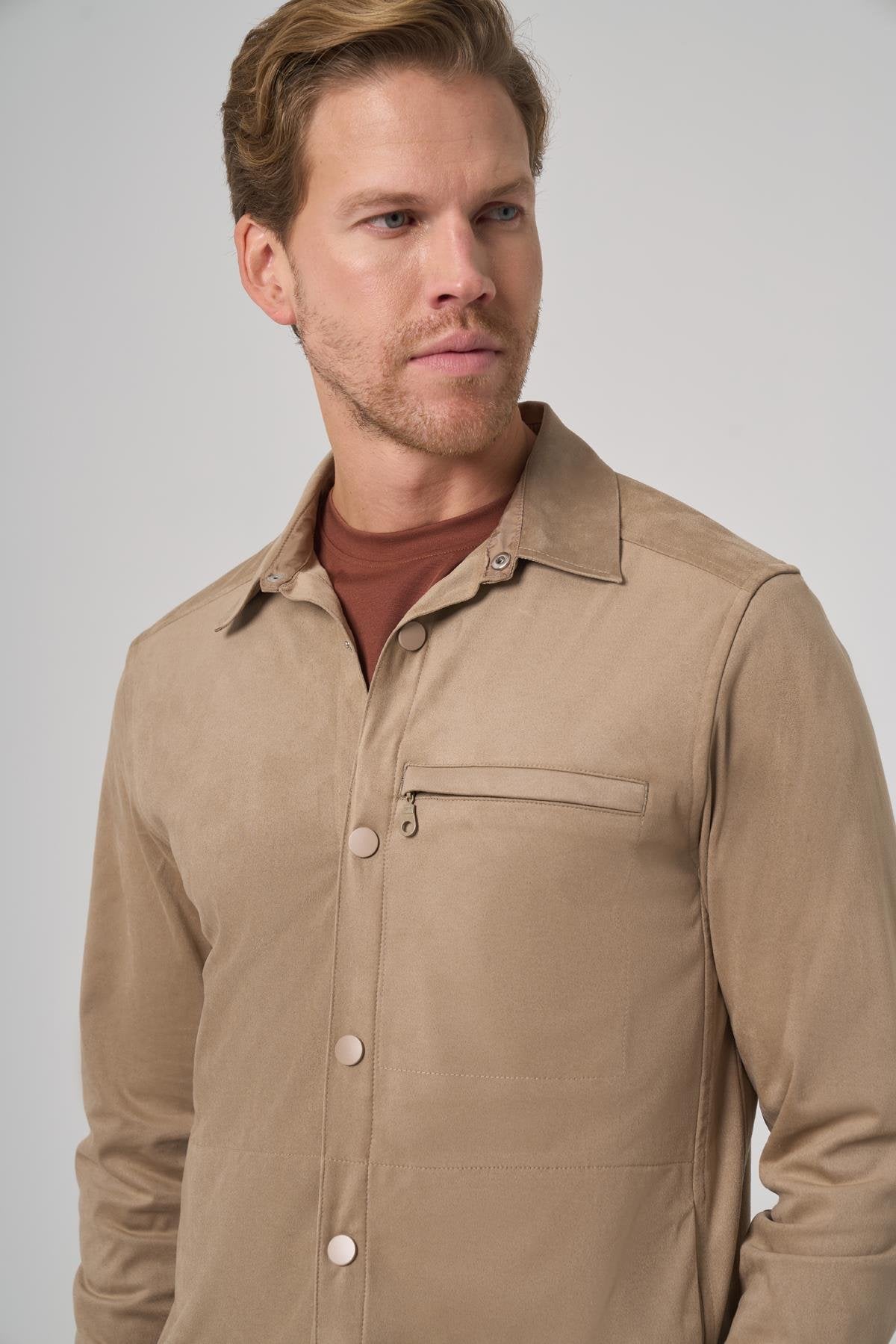 Introducing the Morven Men's Mink Polyester Trend Plain Dynamic Fit Berber Collar Shirt Jacket, designed for modern style and comfort. This jacket features a dynamic fit with a straight silhouette, crafted from a blend of 90% recycled leather and polyester, and 10% lycra, ensuring durability and flexibility. The distinctive berber collar adds a unique touch, while the snap closure provides ease of wear. With practical side pockets for storage and long sleeves, this unlined shirt jacket is perfect for layering in cooler weather or wearing on its own. The model, wearing a sample size L, stands at 188 cm tall with measurements of 96 cm in chest, 81 cm in waist, and 99 cm in hip.
