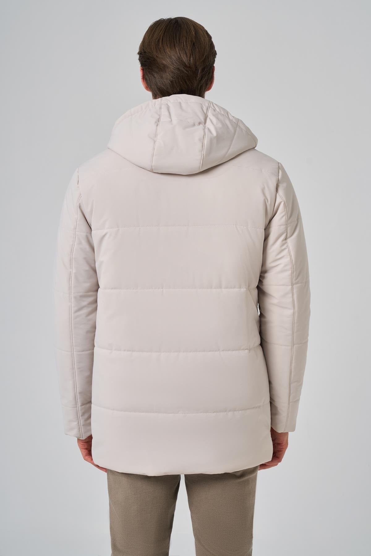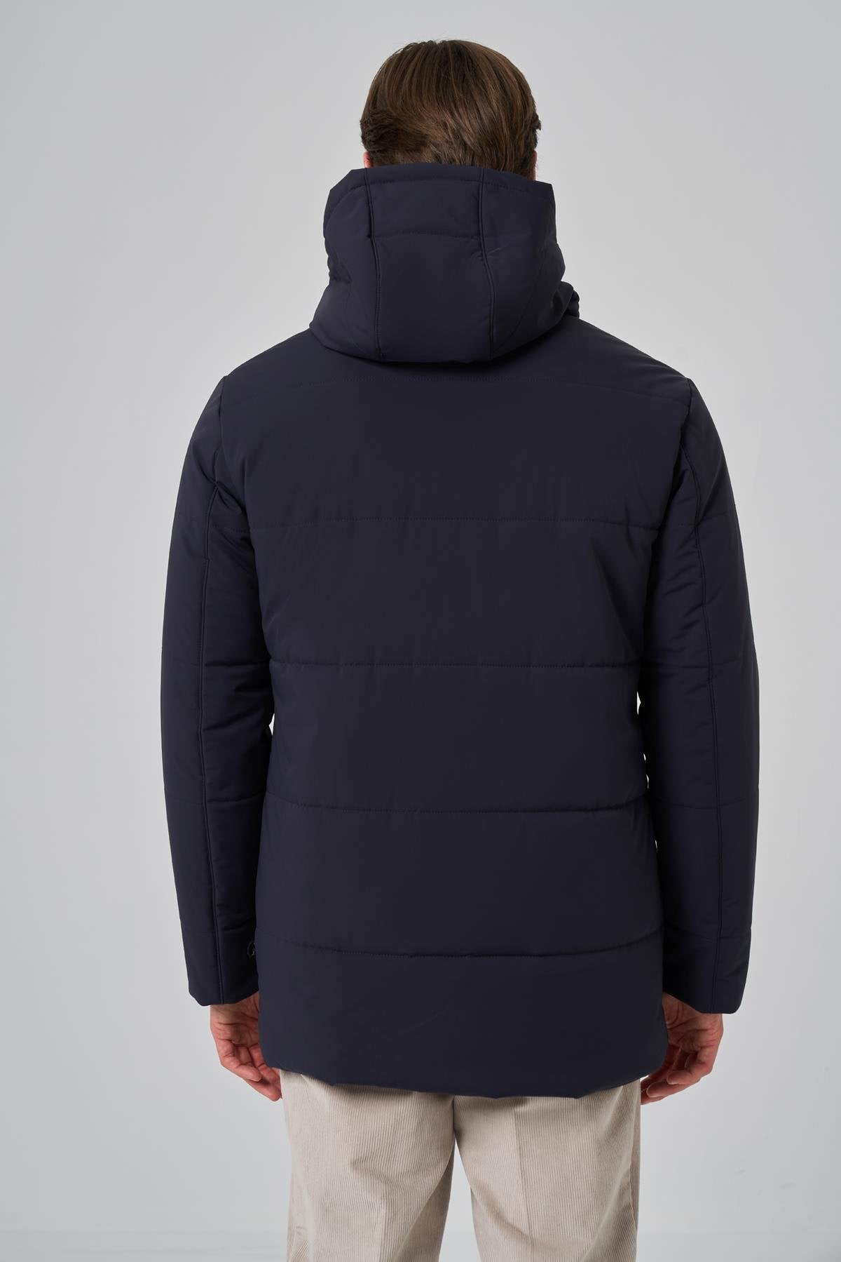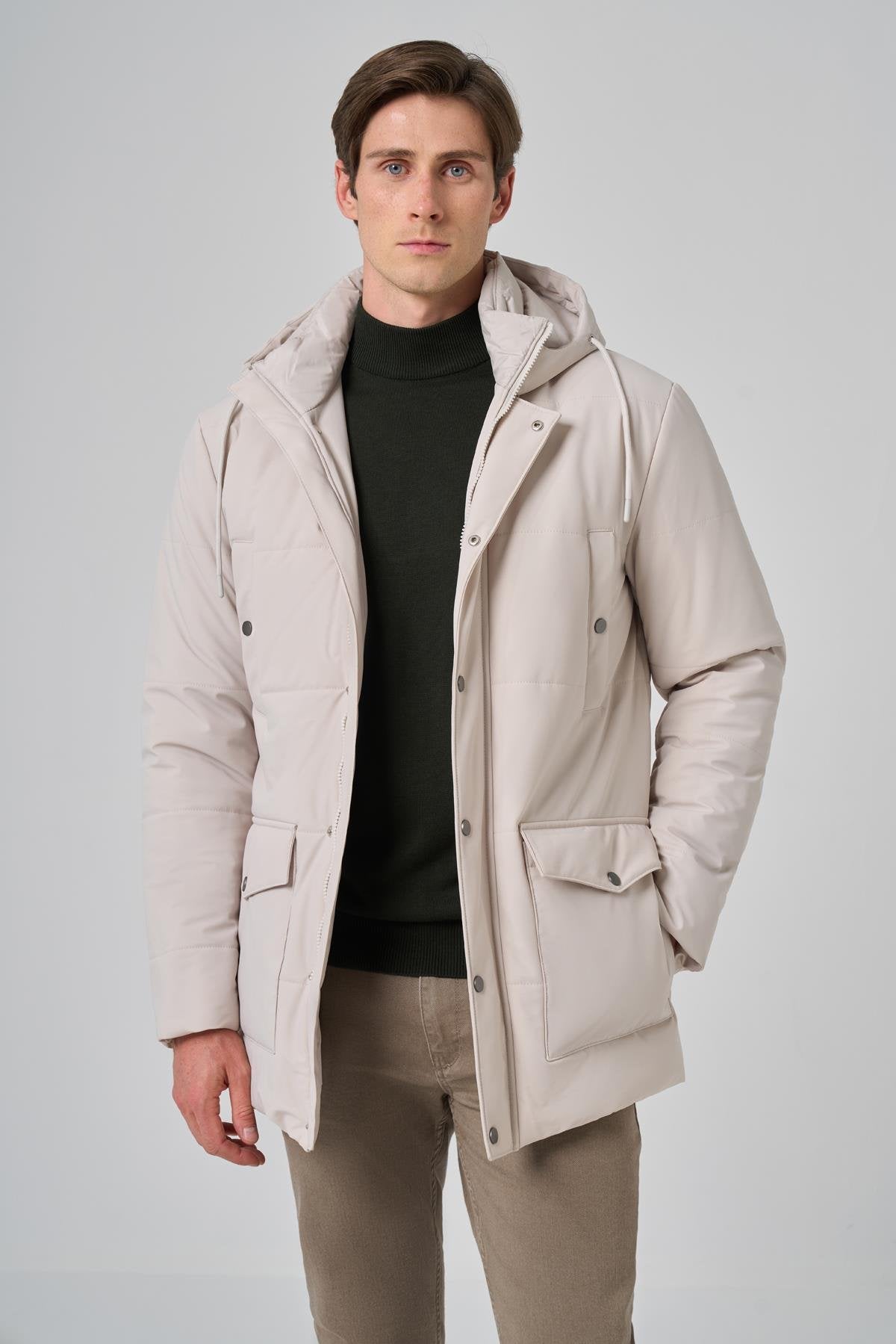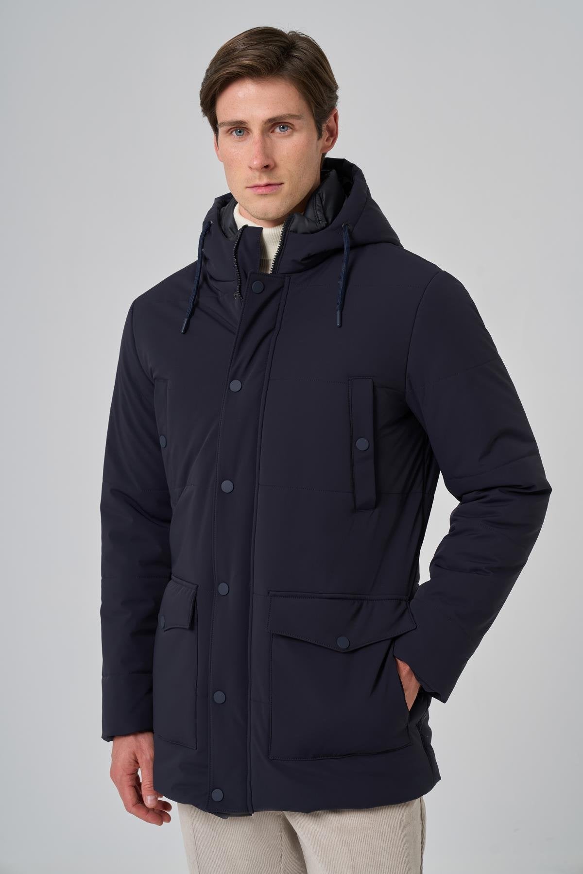 Introducing the Morven Men's Polyamide Snap-Front Hooded Coat, designed for both style and practicality. This coat features a dynamic fit with a straight silhouette, crafted from a blend of 47% polyamide, 35% polyester, and 18% elastane, ensuring comfort and flexibility. The flap pocket provides convenient storage, while the button and zipper closure offers secure wear. With long sleeves and a full lining, this coat is perfect for layering in cooler weather. The model, wearing a sample size L, stands at 187 cm tall with measurements of 99 cm in chest, 80 cm in waist, and 94 cm in hip. Please note that color differences may occur due to lighting and shadows in the studio shooting environment. During the shoot, knitwear, trousers, shoes, shirt, tie, handkerchief, and belt were used as accessories and will not be included.
