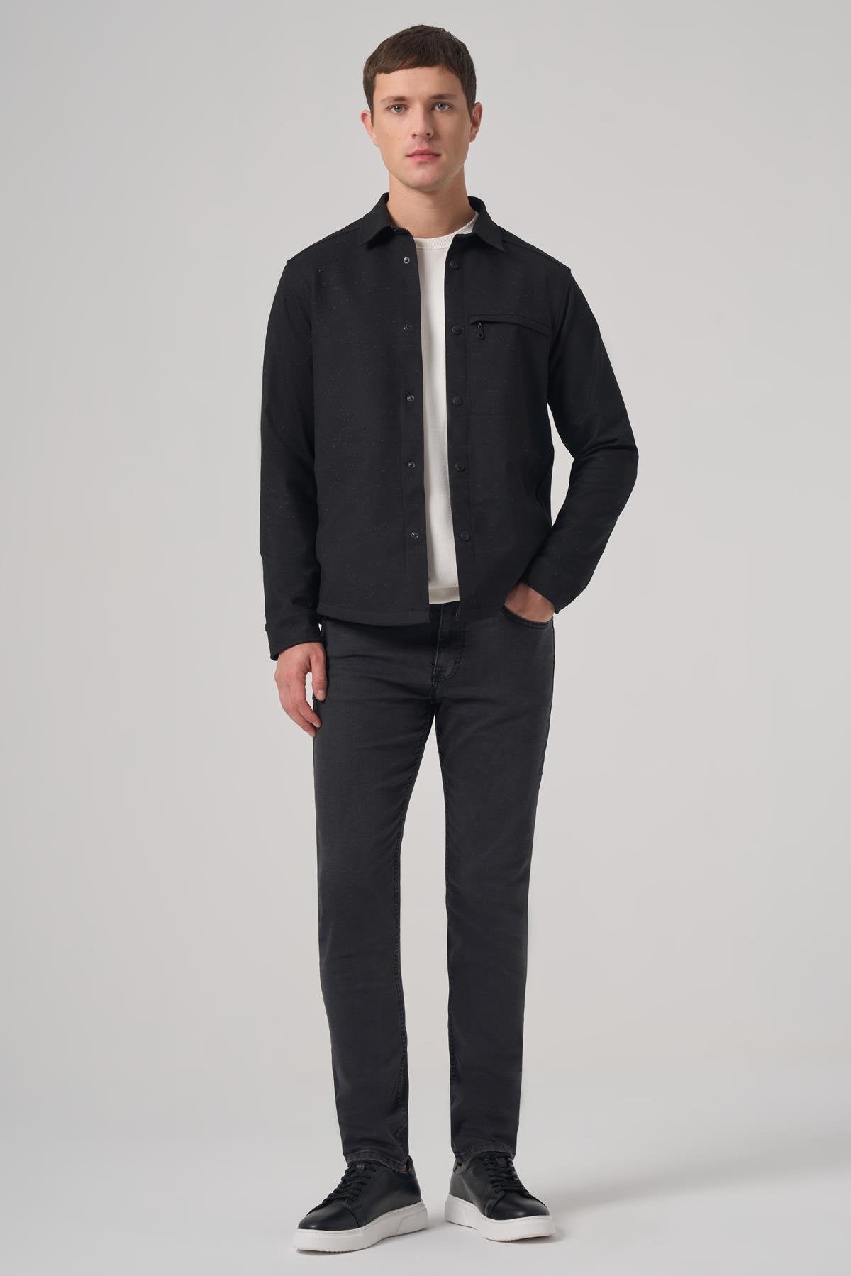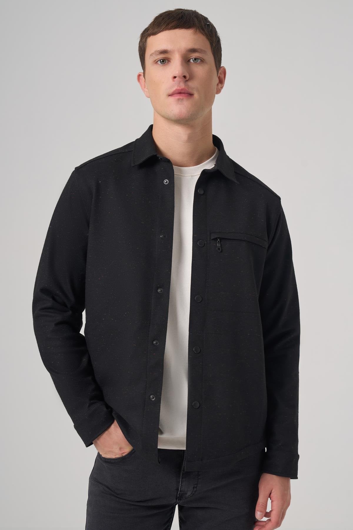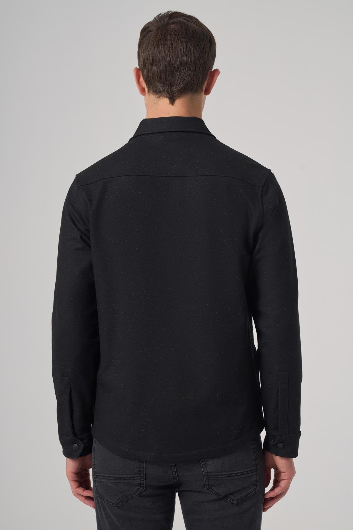 Introducing the Morven Men's Black Polyviscon Trend Plain Dynamic Fit Worker Shirt Jacket, designed for modern style and versatility. This jacket features a dynamic fit with a patterned design, crafted from a blend of 74% polyester, 22% viscose, and 4% lycra, ensuring comfort and flexibility. The distinctive berber collar adds a unique touch, while the snap closure provides ease of wear. With practical side pockets for storage and long sleeves, this unlined jacket is perfect for layering in cooler weather or wearing on its own. The model, wearing a sample size L, stands at 188 cm tall with measurements of 96 cm in chest, 81 cm in waist, and 99 cm in hip. Please note that color differences may occur due to lighting and shadows in the studio shooting environment.