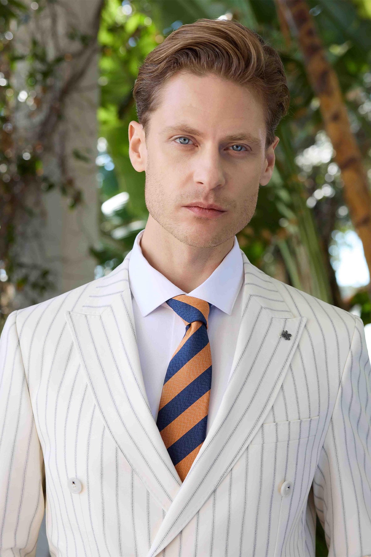 The model in the images stands at 189 cm tall with measurements of 98 cm in chest, 76 cm in waist, and 97 cm in hip, wearing a sample size 50. Please note that color differences may occur due to lighting and shadows in the studio shooting environment. Additionally, shirts, ties, belts, handkerchiefs, and shoes will not be included as accessories during the shoot and will not be sent with the suit.