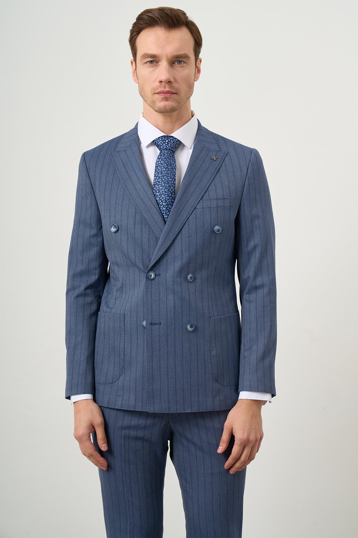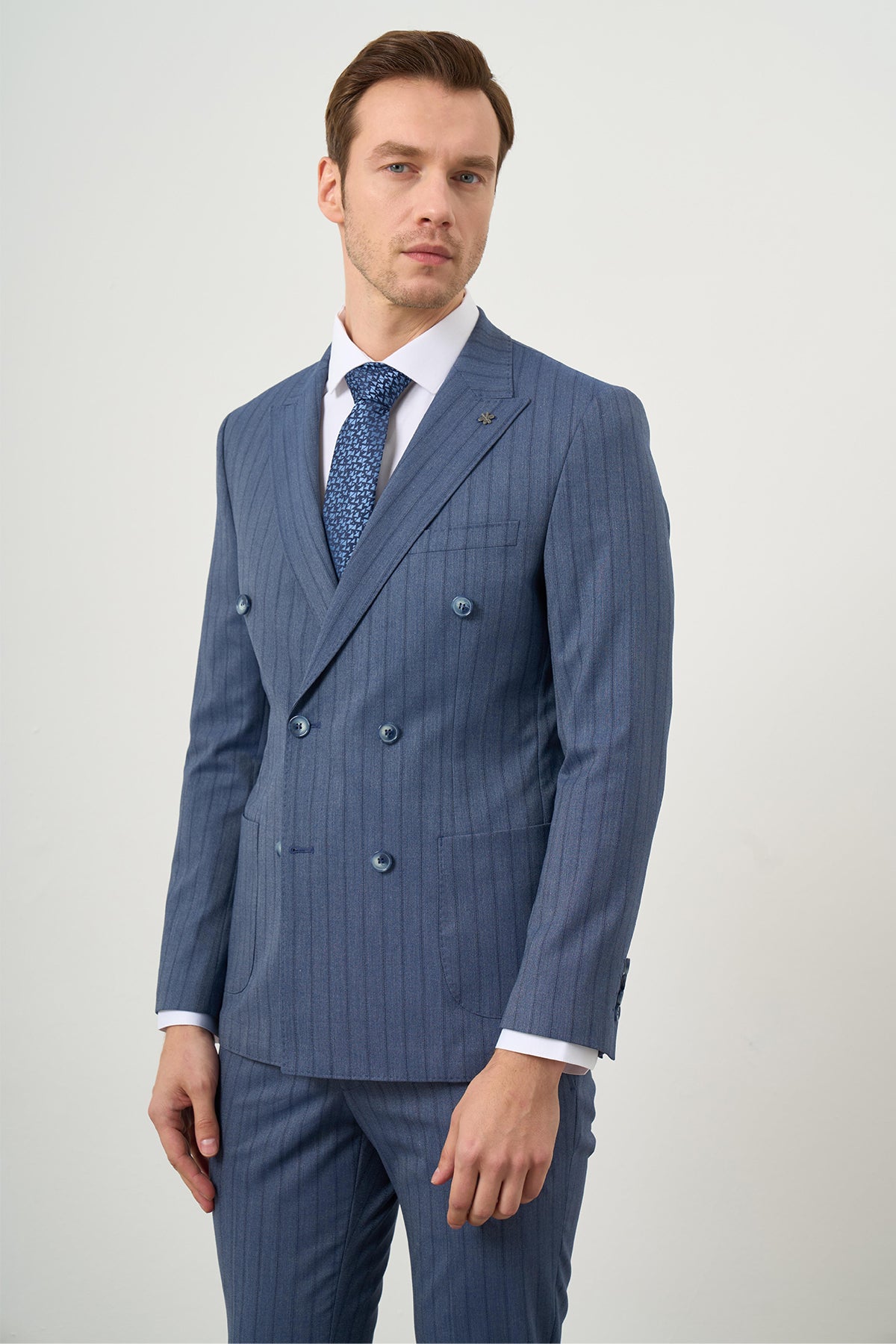 Featuring a pointed collar, this suit exudes elegance and refinement. The double-breasted style enhances its classic appeal, making it suitable for formal occasions and business meetings. Additional features include a convenient bag pocket, button closure, and long sleeves for versatility. The suit is unlined, promoting breathability, and the double slit at the back allows for improved mobility.