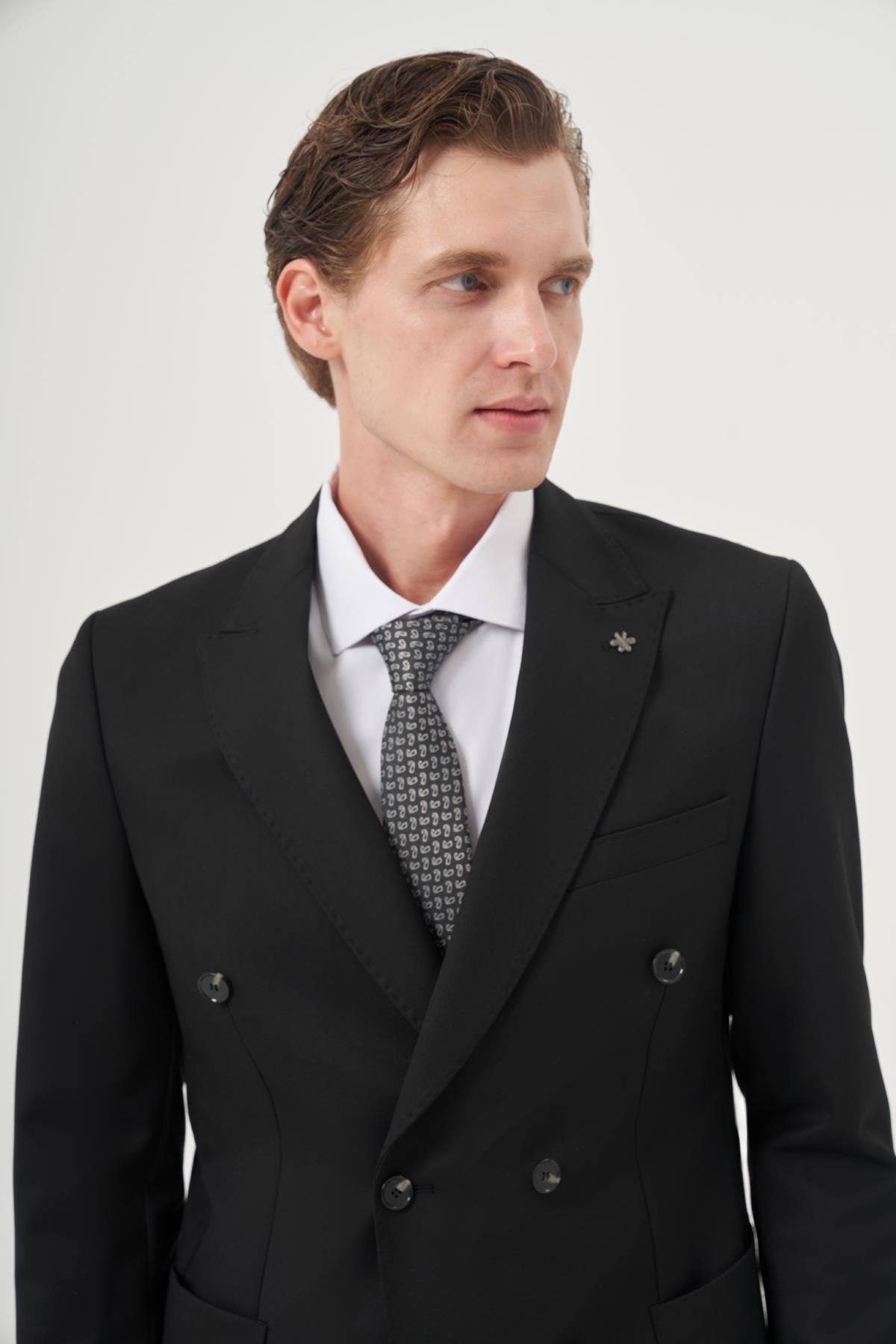 The Morven Men's Black Polyviscon Double Breasted Slim Fit Pointed Collar Suit is a sophisticated choice for the modern gentleman, designed to make a bold statement at any formal event. Crafted from a high-quality blend of 75% polyester, 21% viscose, and 4% elastane, this suit offers both comfort and style. The classic pointed collar and double-breasted design provide a refined look, making it perfect for business meetings or special occasions.