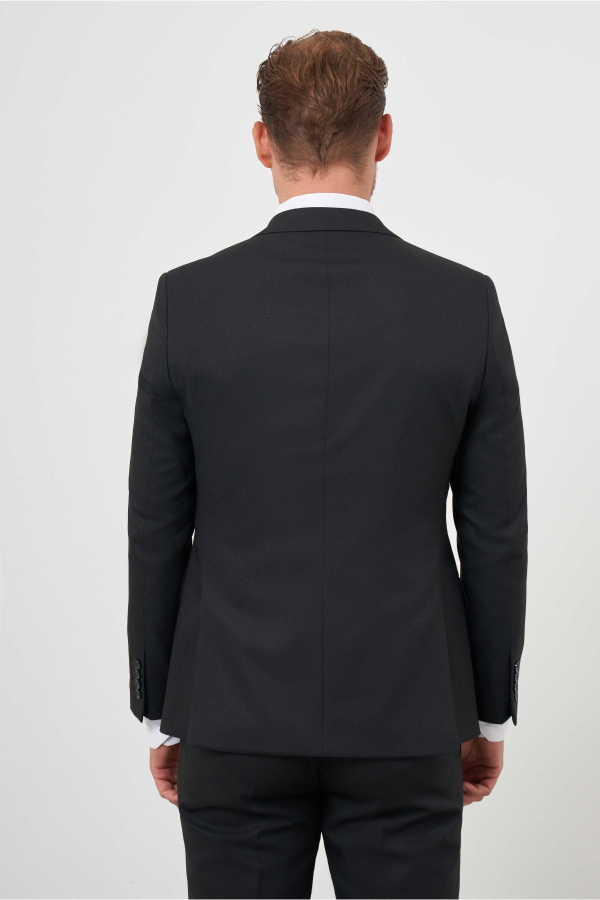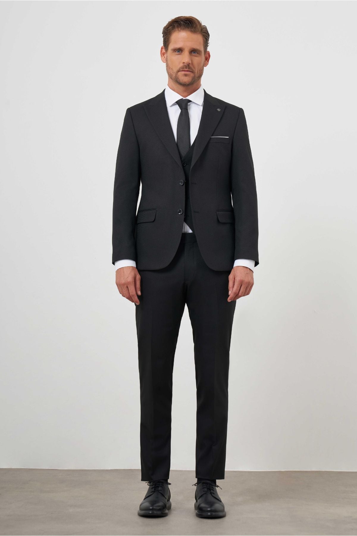 The Morven Men's Black Slim Fit Jacquard Suit is a stylish and sophisticated choice for the modern gentleman. Crafted from a premium blend of 65% polyester, 33% viscose, and 2% Lycra, this suit offers comfort and flexibility. The slim fit design ensures a tailored appearance, while the elegant jacquard pattern adds a touch of luxury.