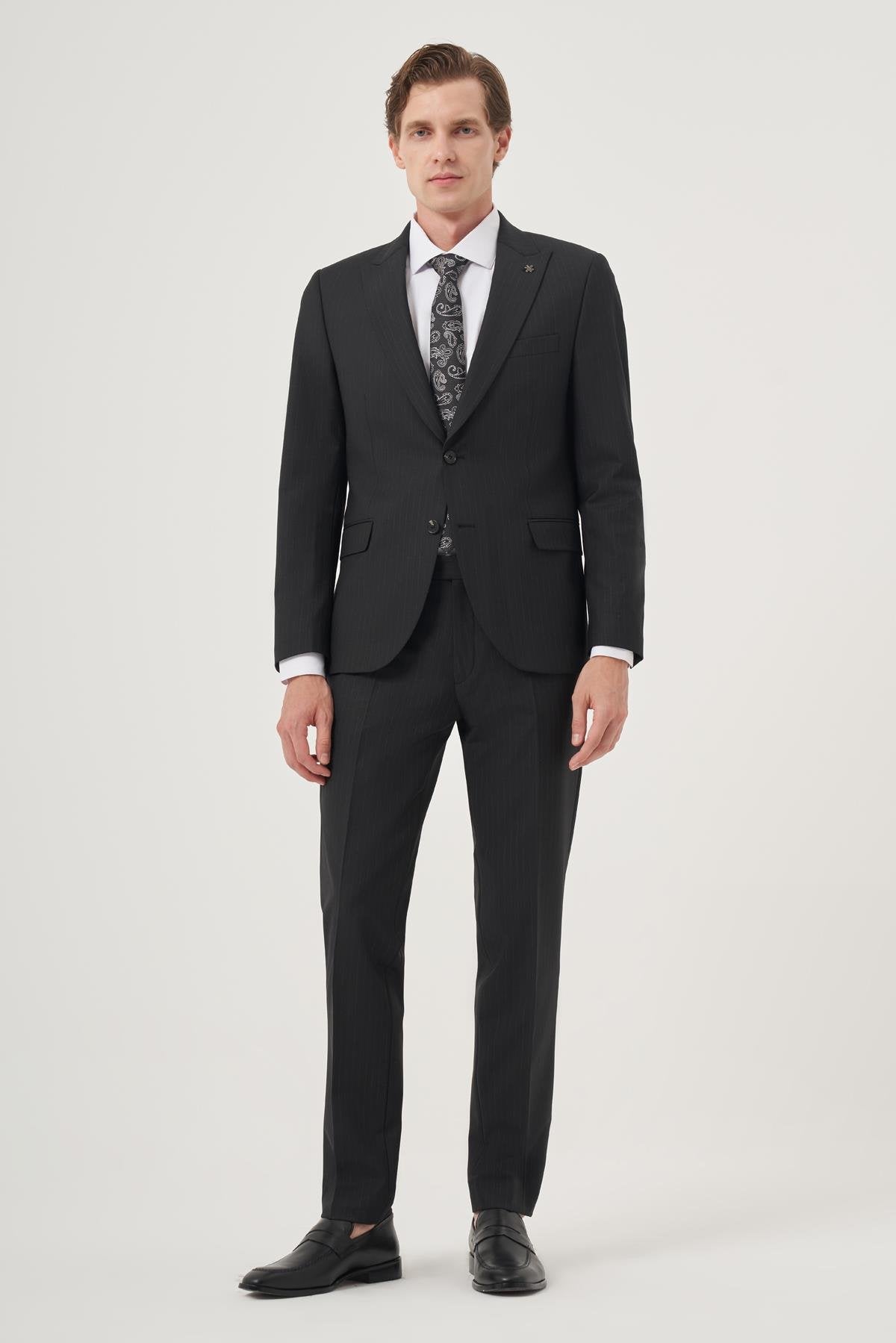 The Morven Men's Black Wool Platinum Classic Striped Slim Fit Pointed Collar Suit is a refined choice for the modern gentleman, perfect for formal events and professional settings. Crafted from a high-quality blend of 54% polyester, 43% wool, and 3% elastane, this suit combines style with comfort.