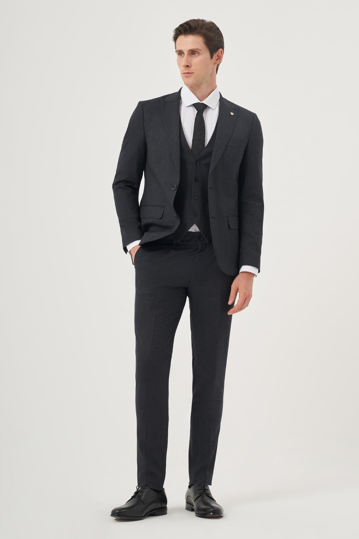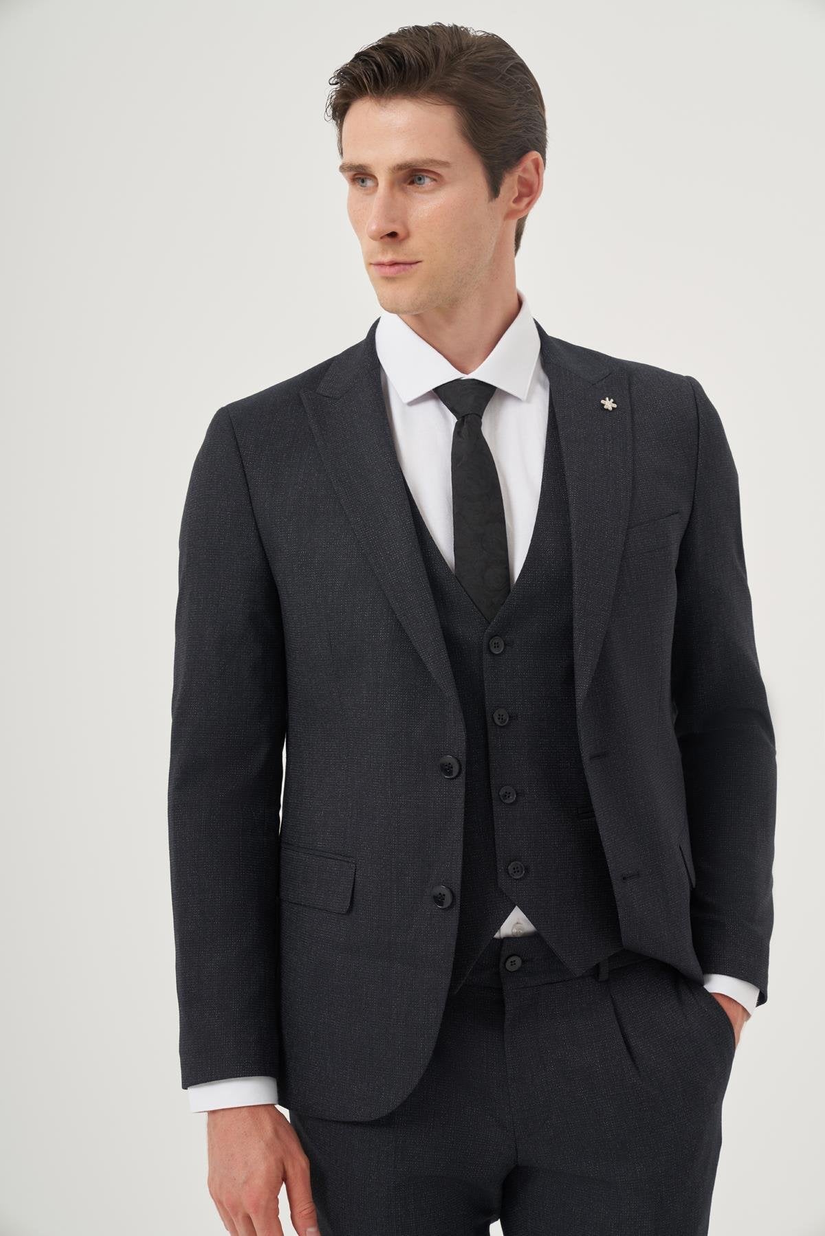 Morven Men's Navy Blue Patterned Slim Fit Vest Suit