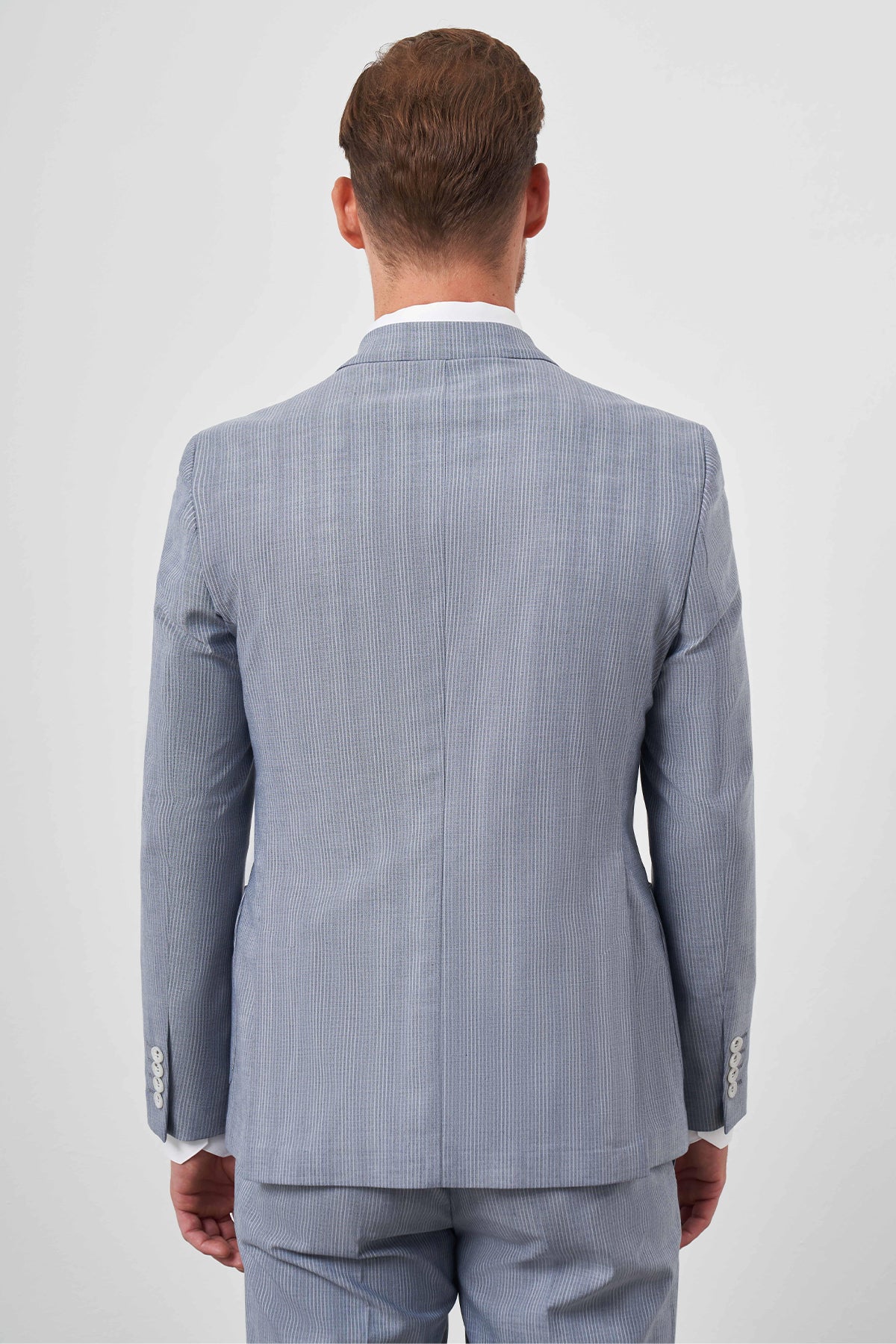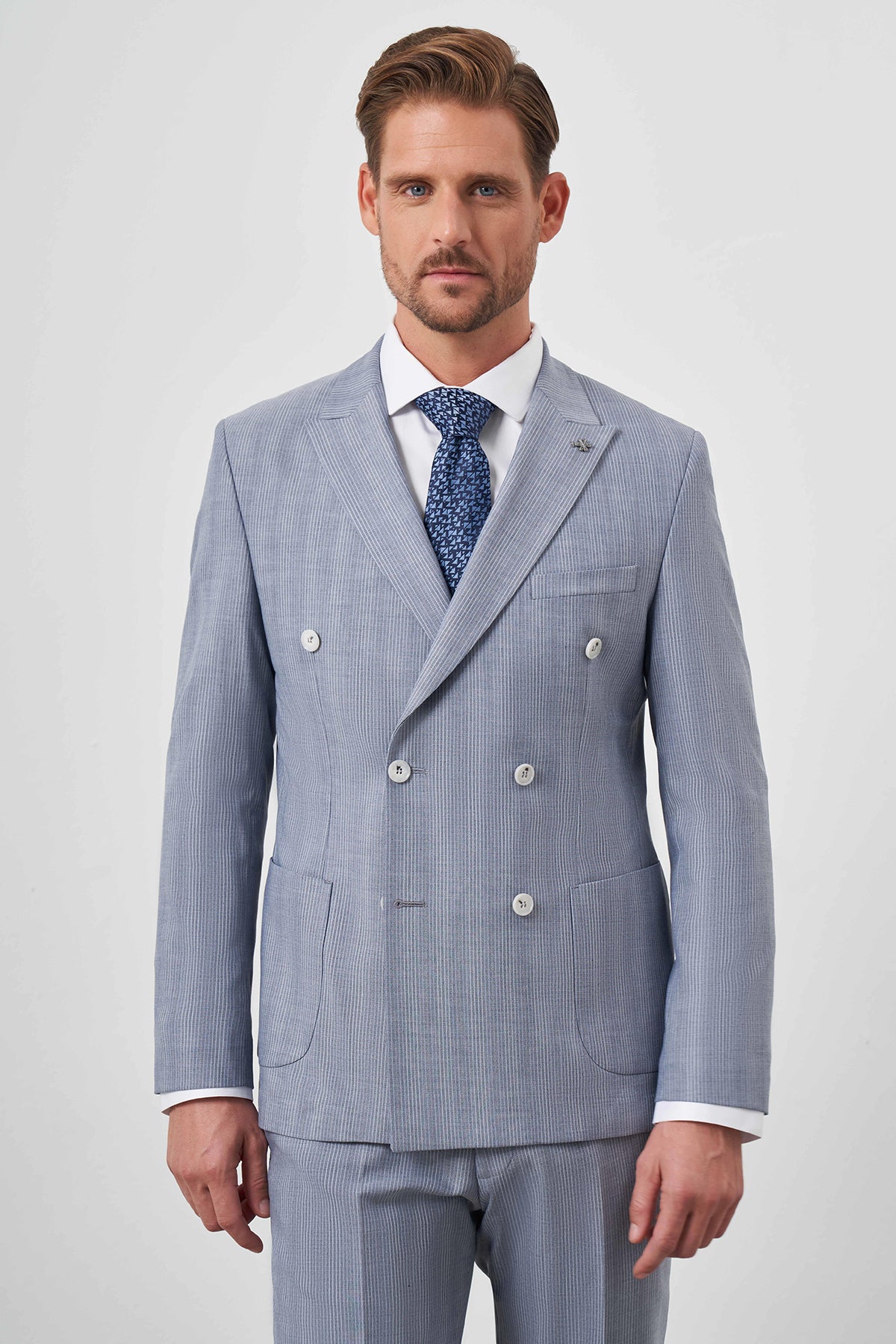 The model in the images stands at 187 cm tall with measurements of 99 cm in chest, 80 cm in waist, and 97 cm in hip, wearing a sample size 50. Please note that color differences may occur due to lighting and shadows in the studio shooting environment. Additionally, shirts, ties, belts, handkerchiefs, and shoes will not be included as accessories during the shoot and will not be sent with the suit.