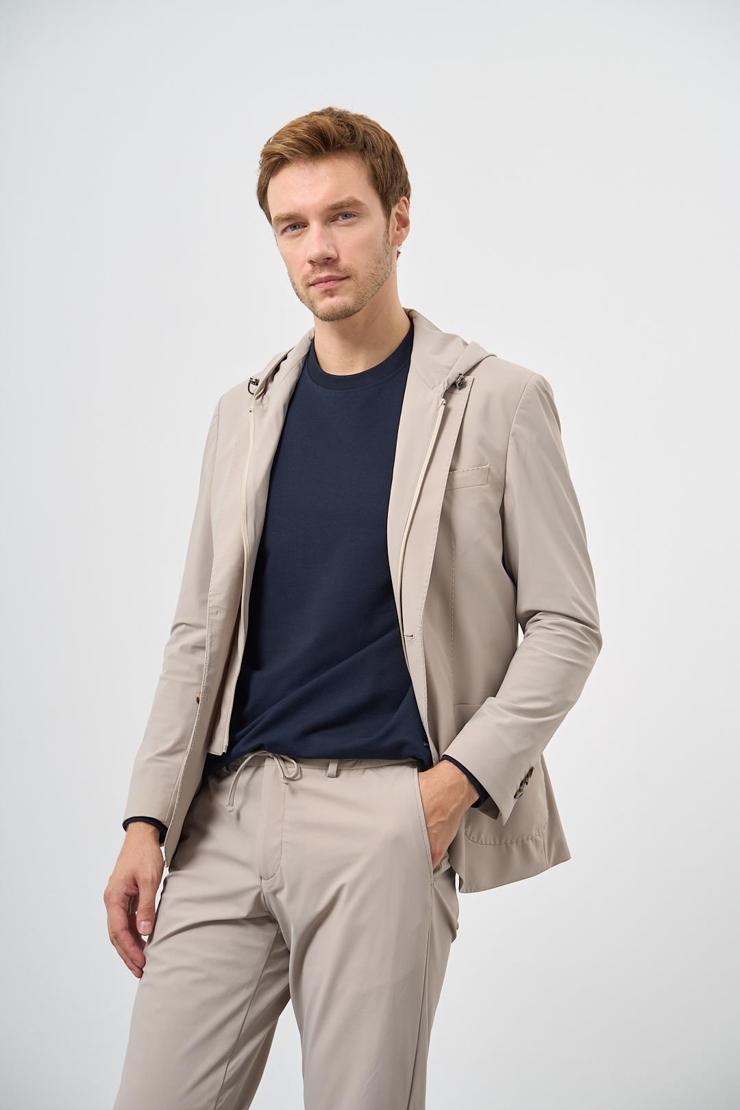 Stay active in style with the Morven Men's Polyamide Slim Fit Sports Suit, made from a premium blend of 77% Polyamide and 23% Elastane for flexibility, durability, and comfort. Designed with a mono collar, hood, pouch pocket, button closure, long sleeves, and double slit detailing, this straight-cut slim fit suit is perfect for gym sessions, casual wear, or outdoor activities. Model measurements: Height 188cm, Chest 96cm, Waist 82cm, Hip 95cm, wearing sample size 50. Please note: shirts, ties, belts, handkerchiefs, and shoes are not included. Colour may vary slightly due to studio lighting.