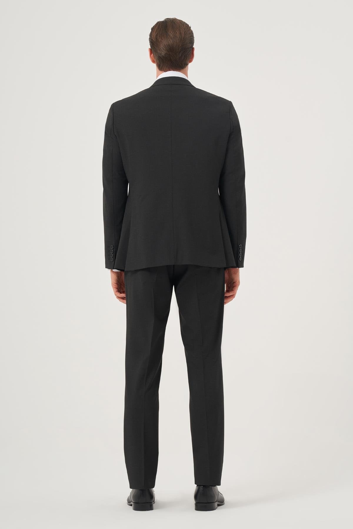 The model stands at 187 cm and wears a sample size 52, showcasing the tailored fit. Please note that color variations may occur due to studio lighting, and accessories such as shirts, ties, belts, and shoes are not included. Elevate your wardrobe with this essential suit that combines classic style with contemporary design.