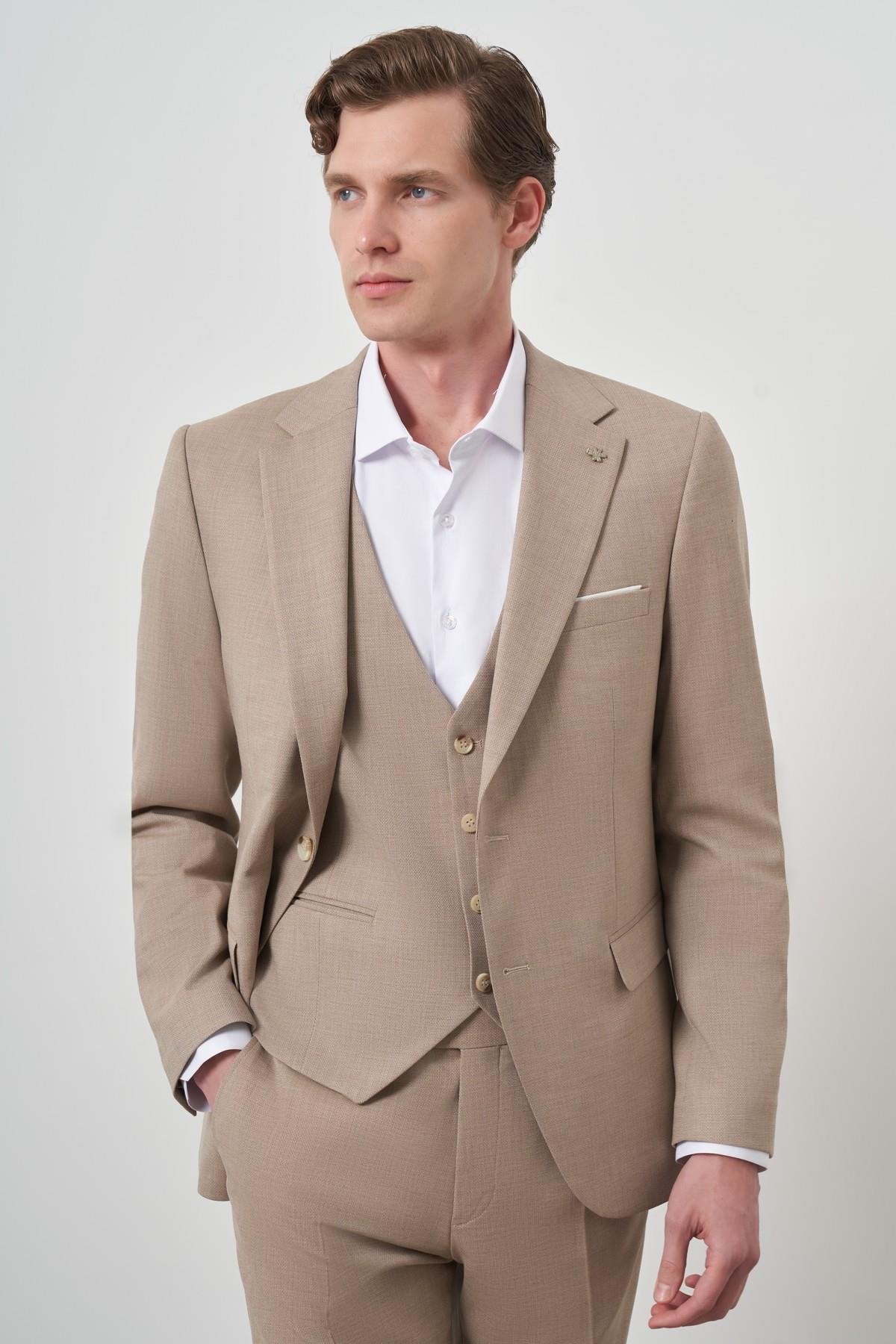 Morven Men's Beige Wool Slim Fit Vested Mono Collar Suit